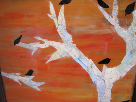 I got so excited I already painted this one. You can't really tell by the photo but the trees are made up of old maps! The colors are golds, oranges and reds.